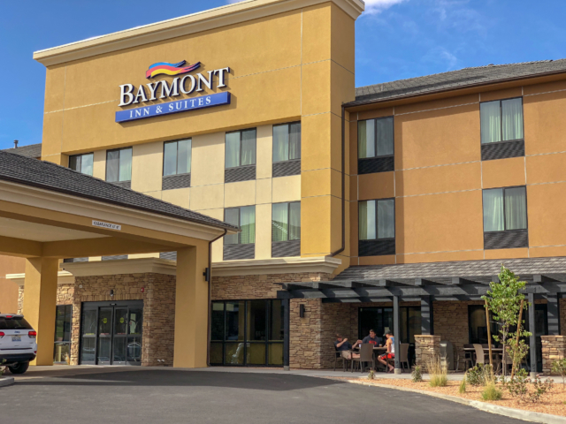 Built in 2018, the Baymont by Wyndham Page Lake Powell is a gleaming, brand-new facility. This fresh, clean building still has the new-paint smell, and its well-lit hallways and public spaces positively sparkle. The front entrance features a large overhang where you can pull-up your car when arriving or departing the hotel, making checking-in and/or checking-out a smooth experience. The front desk is staffed 24-hours a day, and several employees are multilingual. The lobby is home to several comfy couches—perfect for hanging out with family members between excursions or just lounging with a cup of coffee while you recount your latest adventure—and is done up in a variety of greens, yellows, and brown. Impressionistic paintings of red and orange local landscapes line the walls, while a small but pleasant patio space, suitable for a variety of activities, is located just off the hotel’s breakfast nook. From certain spots throughout the hotel you can even catch a glimpse of Glen Canyon Dam!
