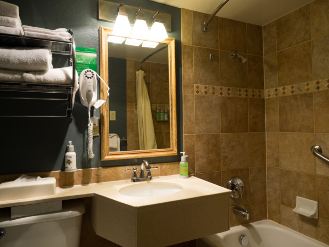 Rooms are also available with one king bed or two queen beds. Otherwise, all rooms contain a handy Keurig coffee maker, flat-screen TVs, and all the basics like telephones and hair dryers. Rooms also include valuable assets like refrigerators, which can help early risers looking to maximize their time at the Grand Canyon by breakfasting in their room. Bathrooms are clean and modern, offering all of the essentials to guests like shampoo and conditioners. Guests who’ve forgotten anything can pop into a nearby gift shop without too much trouble.